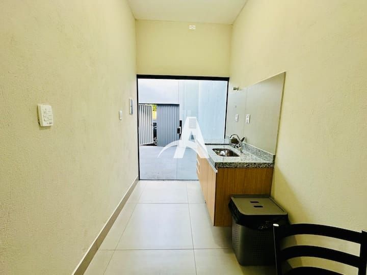 Kit net localizado no bairro Minas Gerais, possui quarto com armário, banheiro com armário abaixo da pia, box e espelho, cozinha com armário abaixo da pia, área de serviço separada e 01 vaga da garagem