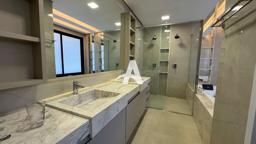 No segundo piso: sala de TV com ar-condicionado, escritório e 03 suítes com armários planejados, sendo 02 com ar-condicionado e 01 suíte master com banheira de hidromassagem