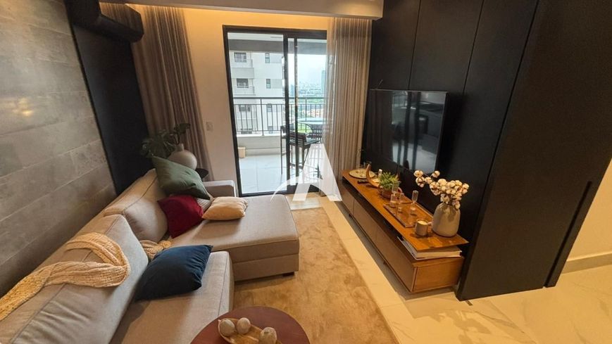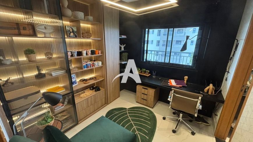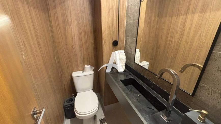 Totalmente climatizado e com móveis planejados, o imóvel dispõe de sala ampla em 02 ambientes, equipada com mesa, quatro cadeiras, sofá, TV de 75 polegadas, painel e rack, além de lavabo montado