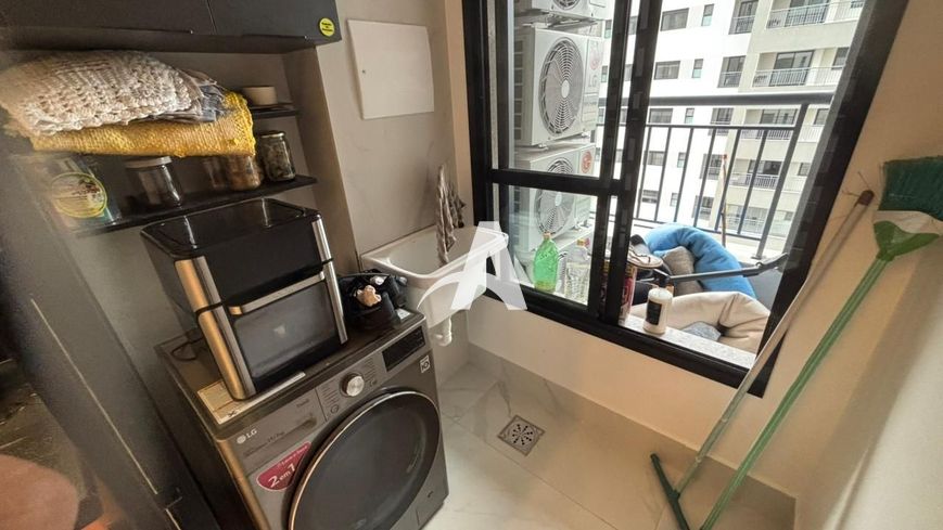 Possui varanda gourmet com churrasqueira e armários, cozinha completa com geladeira, cooktop, forno, coifa e micro-ondas, máquina de lavar roupas e cervejeira